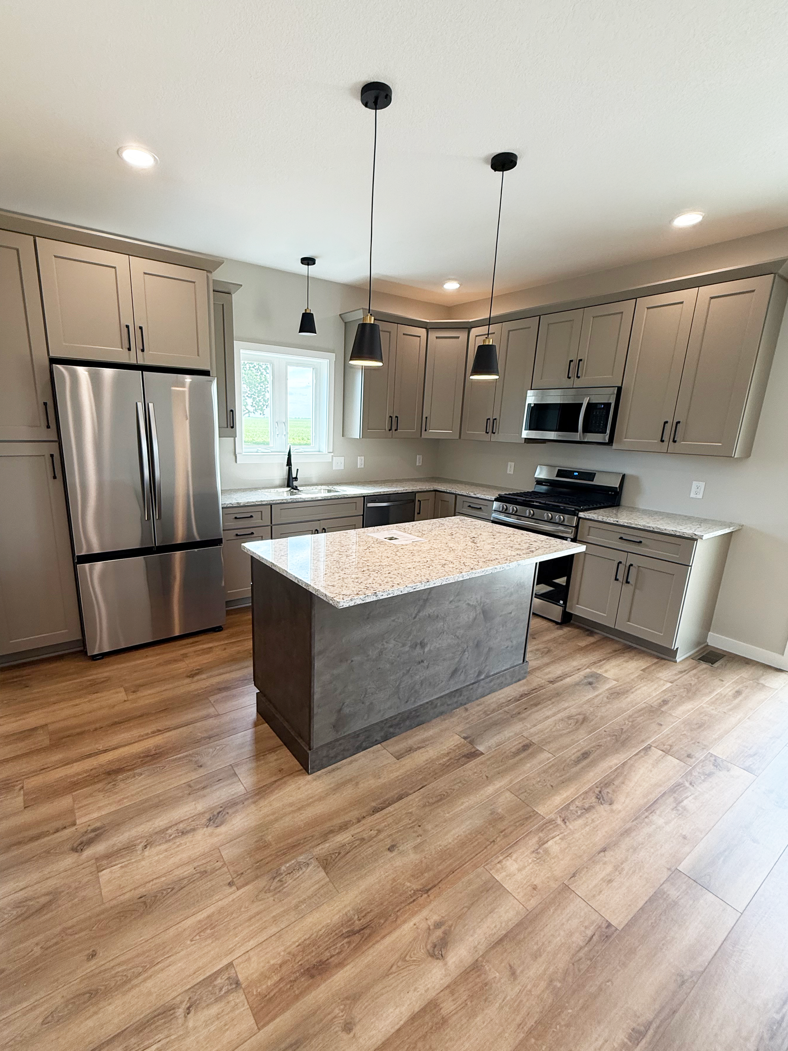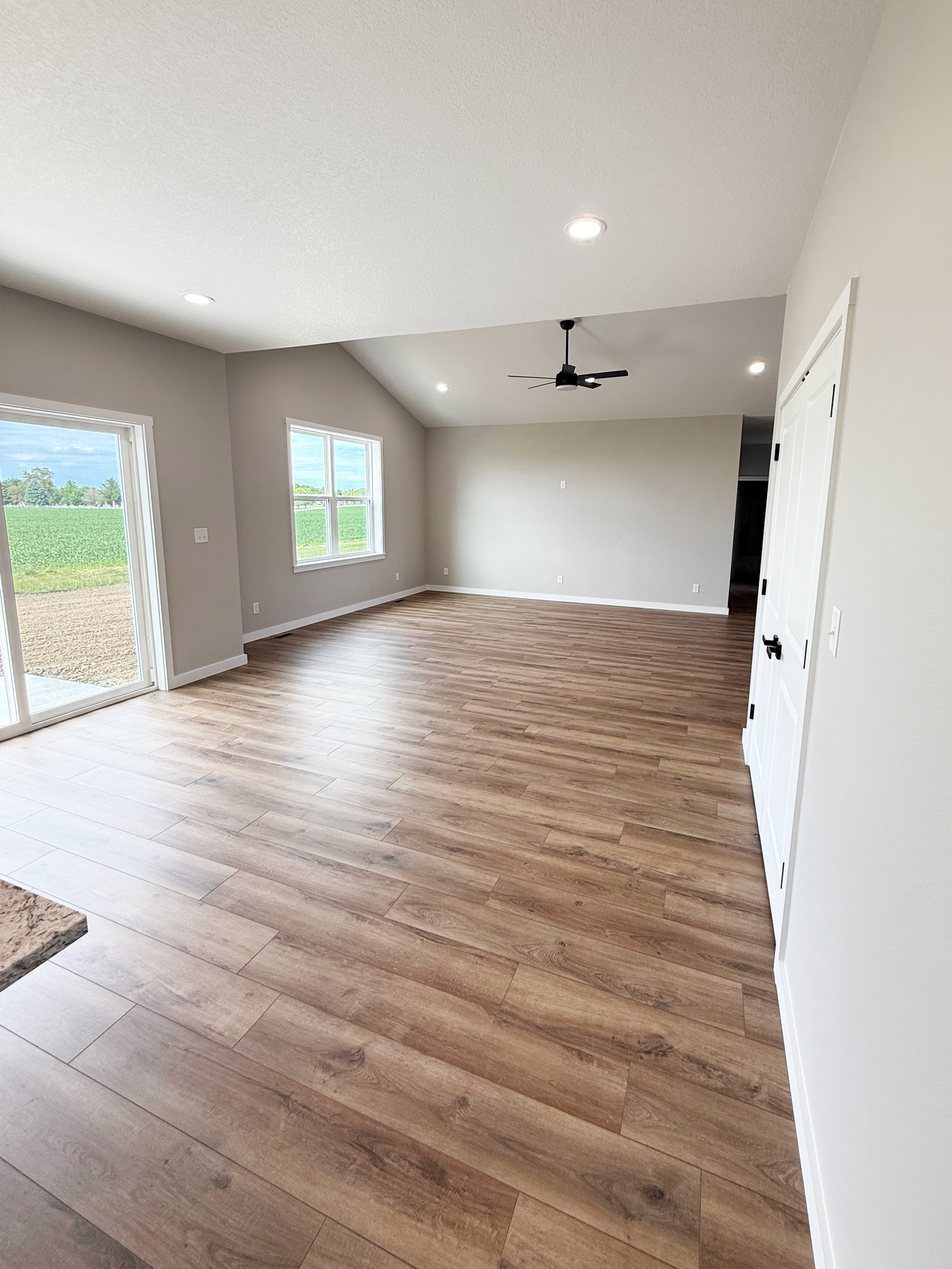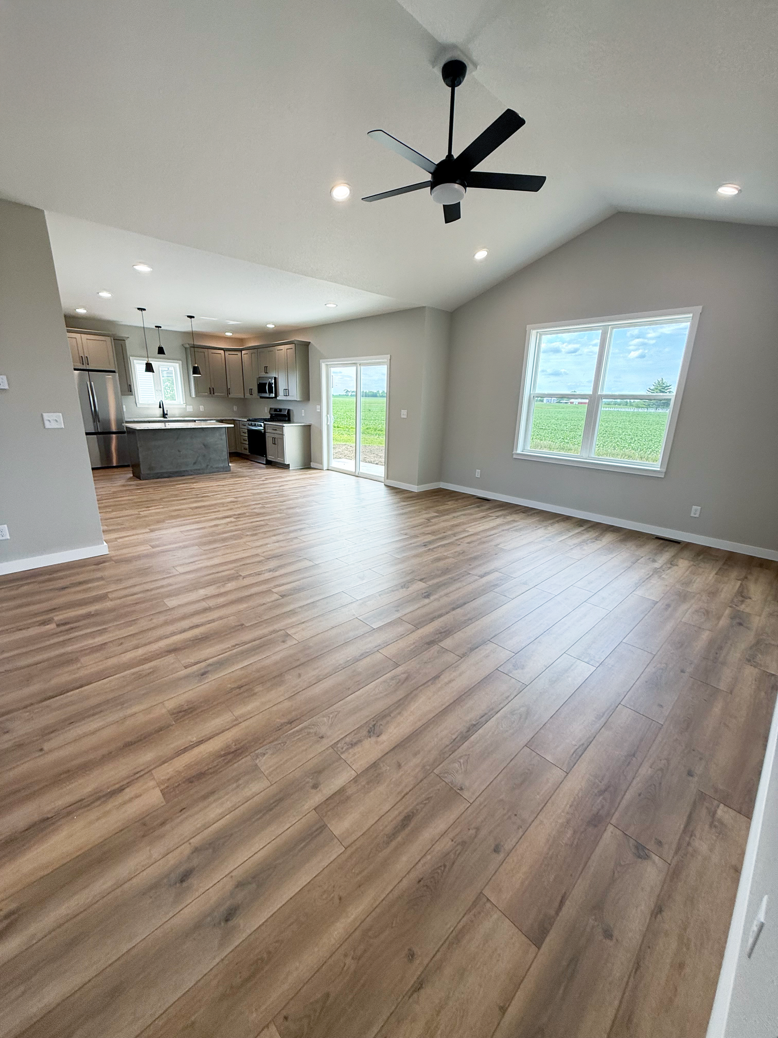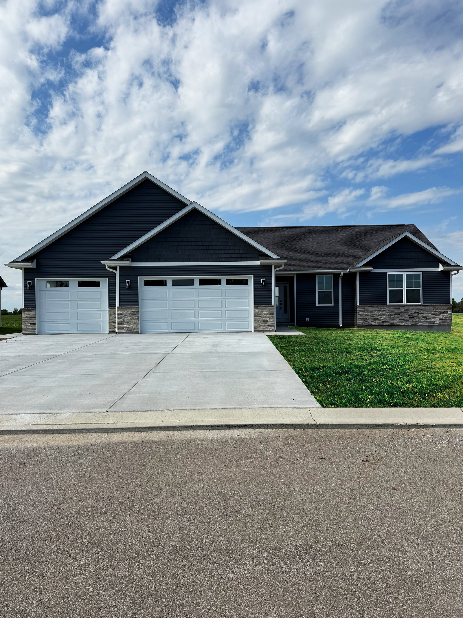 This custom one-story ranch features a striking dark exterior, spacious three-car garage, and a thoughtfully designed interior. Highlights include a vaulted ceiling in the living room, a custom walk-in pantry, and an unfinished basement ready for future expansion. A clean functional layout makes this home perfect for everyday living with room to grow.